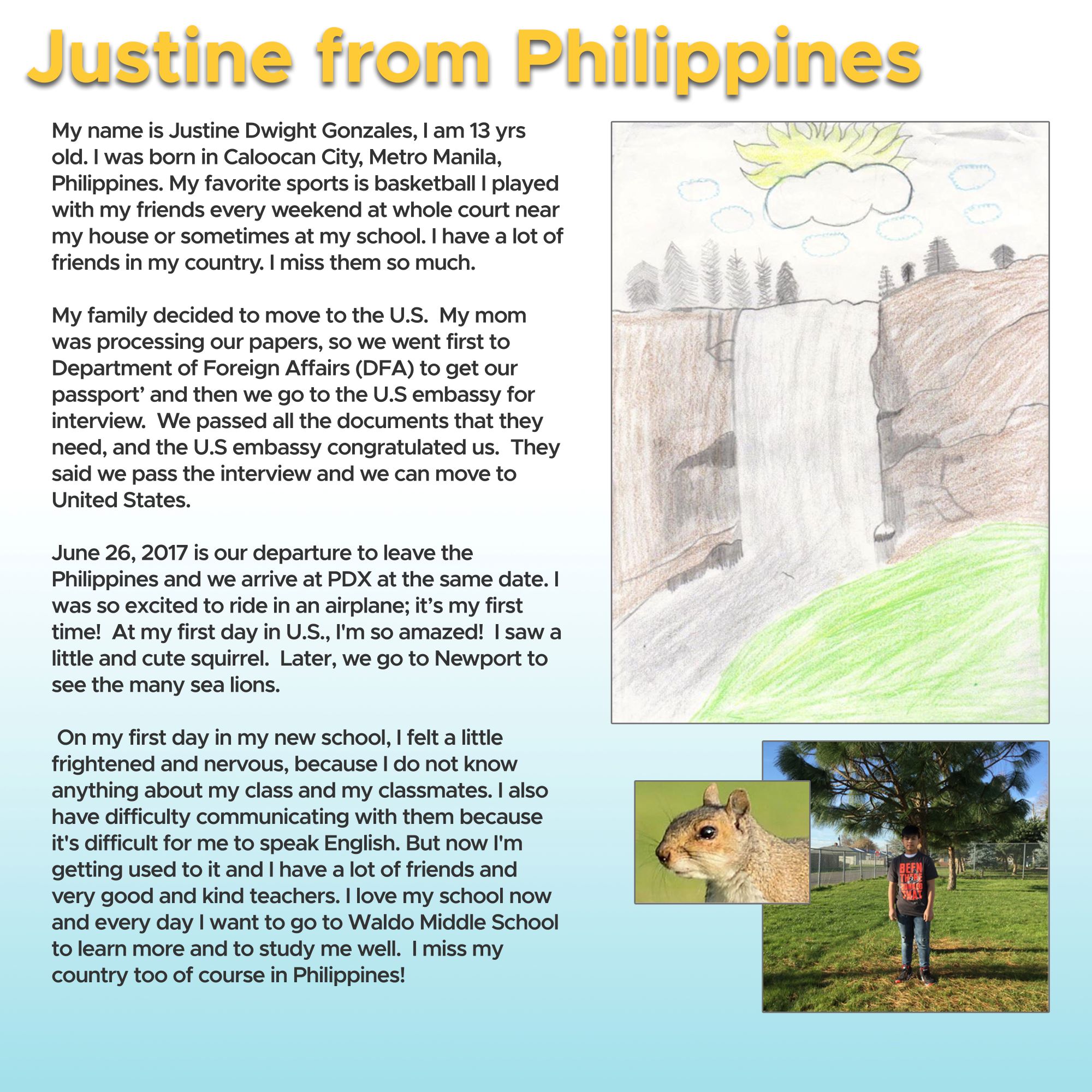 We are also pleased to invite Waldo Middle School's award winning ESL teacher, Sarah Ferguson-Manon to participate in the Exhibit. We will be continuously rotating our the student's art work and stories. Please visit frequently to learn more about our new neighbors.